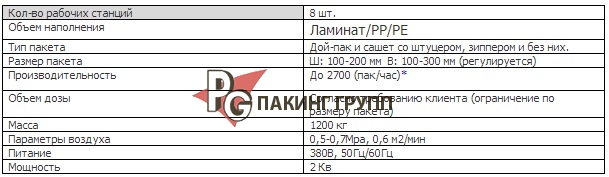 Упаковочный материал — многослойные полимерные плёнки, бумага, ламинированная полиэтиленом, и другие термо свариваемые материалы. Машина комплектуется пневматическими и электронными компонентами ведущих мировых производителей. Упаковочная машина PG8-200 представляет собой автомат роторного типа с 8 рабочими станциями. Благодаря такому количеству станций возможно устанавливать на машину различные узлы дополнительных опций. На автомате продукт заполняется в пакет с последующей запайкой и печатью даты на шве пакета.