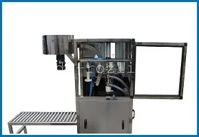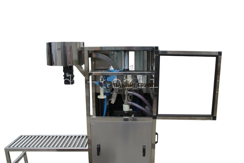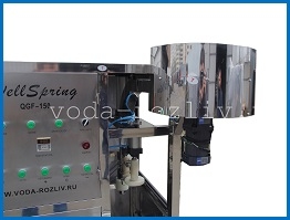 3 этап - укупорка пробкой. Наполненные бутылки пневмоцилиндр перемещает под укупор. Пробки засыпаются в бункер ориентатора, который автоматически выставляет их на необходимую позицию и посредством системы подачи транспортирует к укупору. Пластиковая винтовая крышка прижимается к горлу бутыли посредством пневмопривода. По завершении всех процедур, наполненные бутыли выезжают из моноблока розлива для последующих операций.