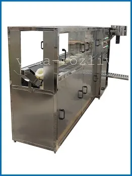 - Транспортировка бутылок внутри аппарата розлива осуществляется в один ряд по втулочному конвееру, который приводится в действие пневмоприводом.