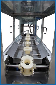 Весь процесс розлива воды в бутылки 19 л проходит в несколько этапов. На первом этапе необходимо подготовить тару перед розливом готовой продукции. Полуавтоматическое оборудование для механической мойки тары внутри и снаружи снимет старую крышку и тщательно вымоет бутыль от сильных загрязнений. Далее 19-литровые бутыли загружаются в моноблок (триблок) QGF-150 WellSpring вручную. Для линий розлива с большой производительностью мы рекомендуем автоматический загрузчик бутылок. Как только бутылки загрузили в моноблок (триблок) розлива QGF-150 WellSpring, начинается второй этап. Бутылки дезинфицируются, ополаскиваются, наполняются готовой продукцией и закупориваются автоматически внутри этого моноблока и подаются на выход на рольганг или транспортер. Начинается 3 этап - термоусадка ТУ колпачков на горло бутыли и упаковка бутылей в ПЭ пакеты. Процесс розлива завершен и бутыли готовы к транспортировке на место складирования и дальнейшей продаже.