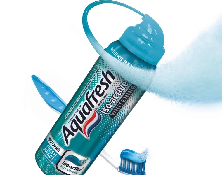 2. Aquafresh баллон –вместо тюбика – алюминиевый баллон с пластиковым дозатором. Снова отметим устойчивость упаковки , бОльшую вместимость, среди минусов – очевидная непортативность.