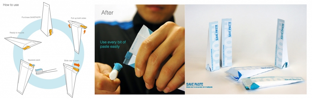 Save Paste — инновационная упаковка для зубной пасты от корейских дизайнеров Sang Min Yu и Wong Sang Lee. Данная упаковка выглядит как упаковка тетрапак для соков и молока. Главная задача, которая решается с такой упаковкой – возможность выдавить всю пасту полностью, а после отправить тюбик на переработку. Благодаря удобному клапану для открытия/закрытия паста не будет скапливаться внутри упаковки.