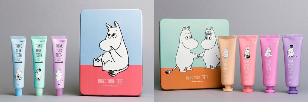 Детская линейка зубных паст Think Your Teeth (Сеул, Корея) – в дизайне веселые цвета и всеми любимые муми-тролли. Чтобы детям было нескучно, было продумано еще и несколько форматов подарочной упаковки, которую потом можно использовать в играх, и специальные муми-косметички для путешествий.