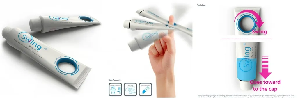 Swing Toothpaste – это тюбик, позволяющий выдавить зубную пасту, не оставив ни капли. Когда вы заметили, что тара практически пуста, нужно надеть тюбик Swing Toothpaste на палец и начинать его раскручивать – этот способ напоминает перематывание старых аудиокассет на карандаше. Таким образом, Вы запускаете принцип центрифуги: с помощью центробежной силы паста направляется от середины к окружности вращения, иначе говоря, к носику тюбик.