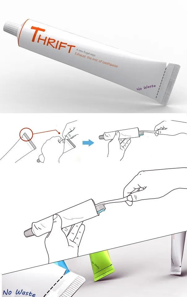 Thrift – очевидное, всем знакомое, но еще ни разу не реализованное в отношении зубных паст решение. Задача — использовать все содержимое тюбика. Нужно просто разорвать тюбик по направлению уже напечатанных штрих-линий в хвостовой части и достать оставшуюся пасту с помощью щетки.