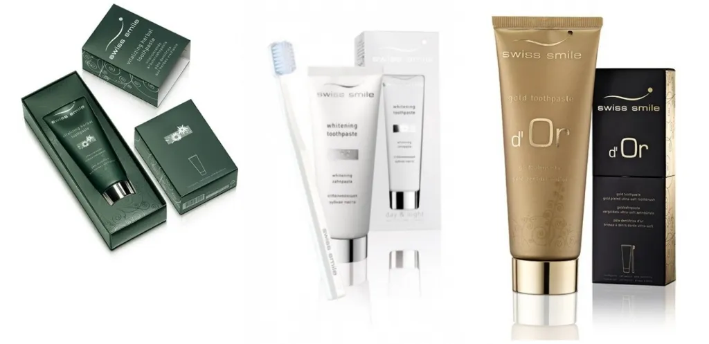 Швейцарская компания Swiss Paste выпускает зубную косметику, отличающуюся эксклюзивным дизайном и превращающую гигиенические процедуры в торжественный ритуал. В сдержанном, но дорогом дизайне обязательно присутсвуют тиснение и металлизация – визуальные маркеры премиального сегмента.