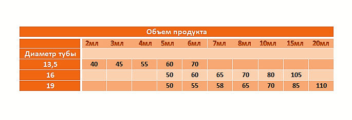 Наиболее популярны тубы диаметром 13,5 – 16- 19 мм, позволяющие выпускать продукты объемом от 2 до 20 мл.