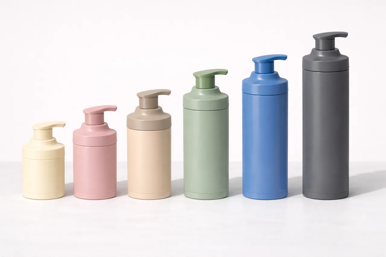 Высота флакона-диспенсера зависит от объёма наполнения, что позволяет сохранять единый дизайн линейки при разных форматах продукта.
